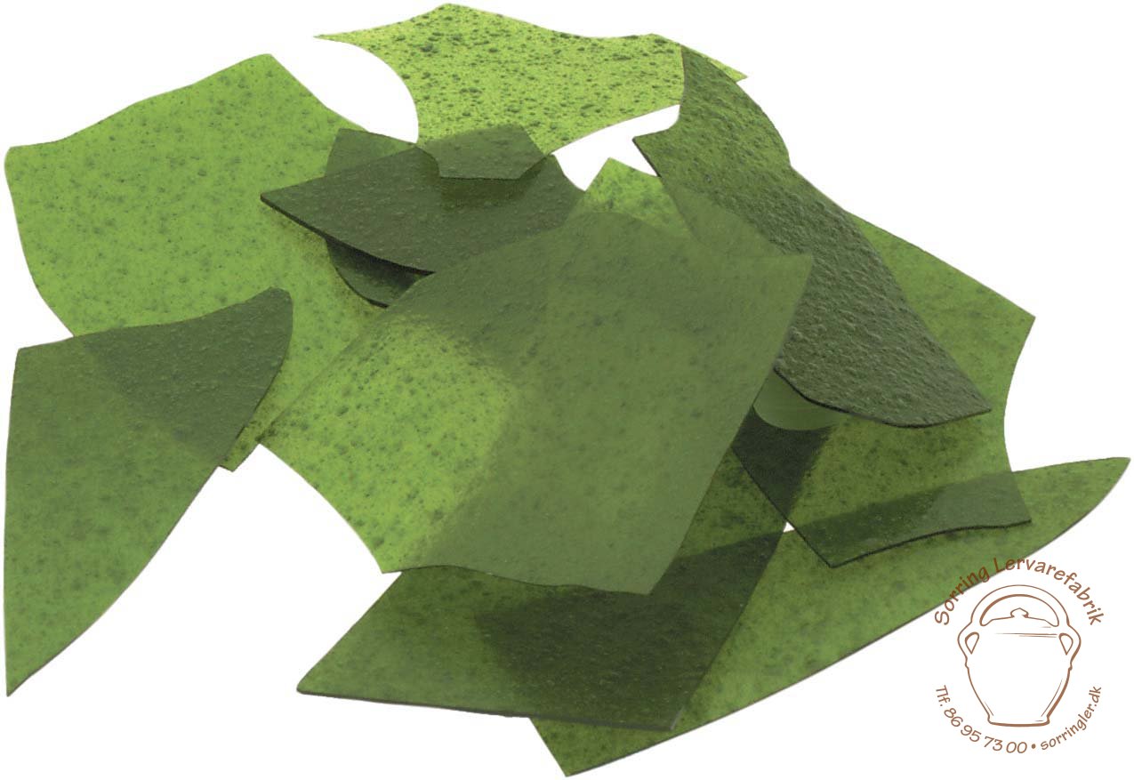 Blyfri, papirstynde stykker, blæst glas. Anvendes til dekorering. Skaber fine skyggeeffekter ved at ligge i forskellige tykkelser.